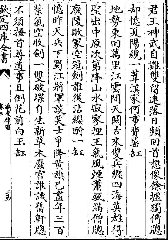 君王神武自难双留连落日频回首想像馀墟独倚窗却忆夏阳才一苇汉家何事费罂缸