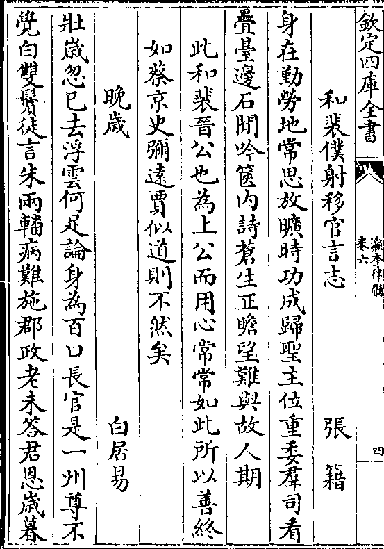 和裴仆射移官言志 张 籍身在勤劳地常思放旷时功成归圣主位重委群司看