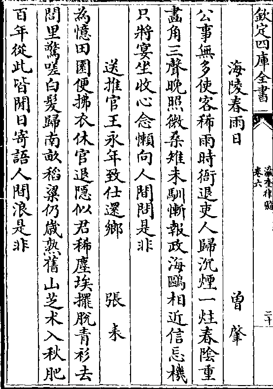 海陵春雨日 曾 肇公事无多使客稀雨时衙退吏人归沉烟一炷春阴重