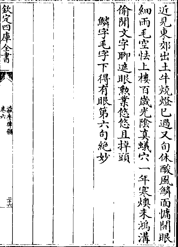近见东郊出土牛烧灯巳过又旬休酸风鳞面慵开眼细雨毛空怯上楼百岁光阴真蚁穴一年寒燠未鸿沟
