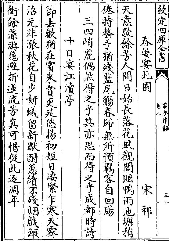 春晏宴北园 宋 祁天意歇馀芳人间日始长落花风观阁睡鸭雨池塘稍