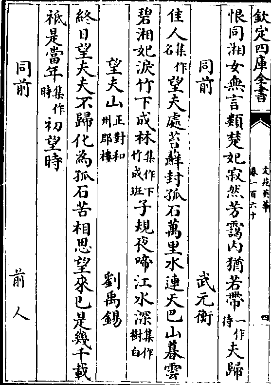 恨同湘女无言类楚妃寂然芳霭内犹若带(一作/待)夫归同前 武元衡