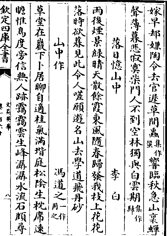 (撼/)芙蕖浪牖(集作/窗)户凉生薜荔风书幌昼昏岚气里巢枝俯(集作/夜)折雪声中山阴钓叟无知已窥镜挦多鬓欲