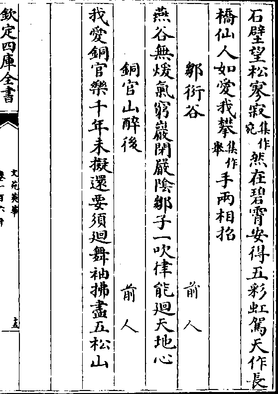 空见我传秘诀精诚与天通何意到陵阳游目送飞鸿天子昔避狄与君亦乘骢拥兵玉(集作/五)陵下长策遏胡