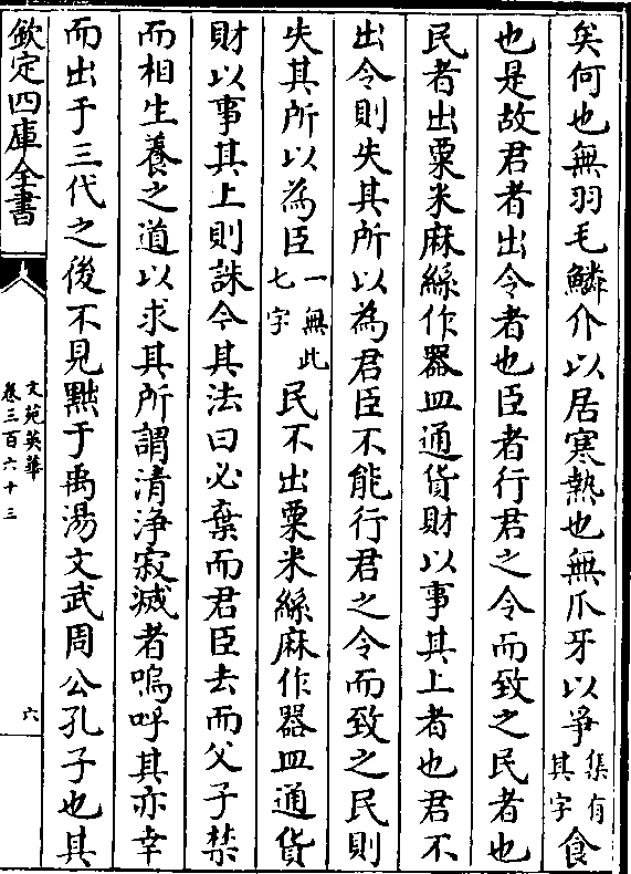 矣何也无羽毛鳞介以居寒热也无爪牙以争(集有/其字)食也是故君者出令者也臣者行君之令而致之民者也