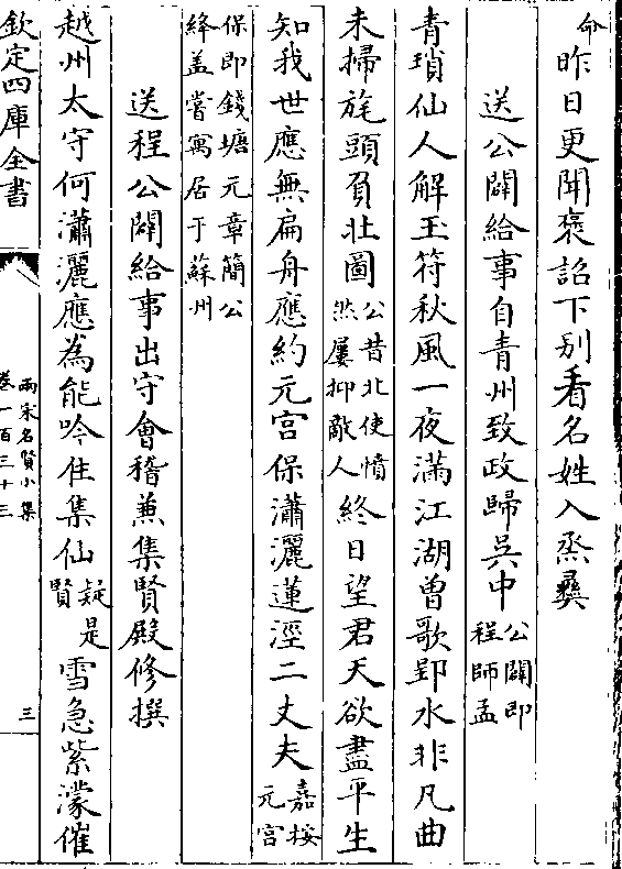 (命/)昨日更闻褒诏下别看名姓入烝彝送公辟给事自青州致政归吴中(公辟即/程师孟)