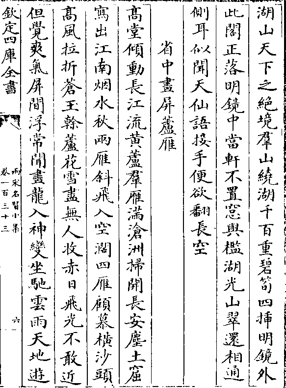 湖山天下之绝境群山绕湖千百重碧笋四插明镜外此阁正落明镜中当轩不置匆与槛湖光山翠还相通