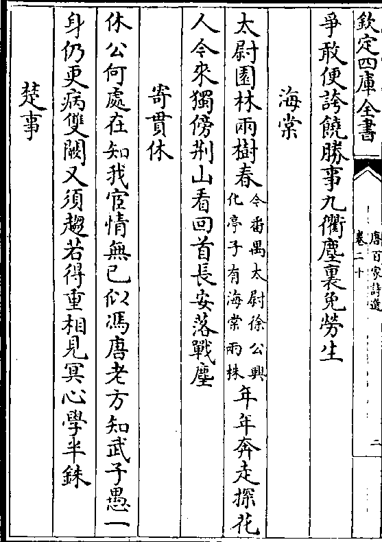 太尉园林两树春(今番禺太尉徐公兴/化亭子有海棠两株)年年奔走探花