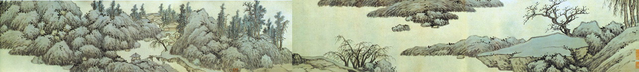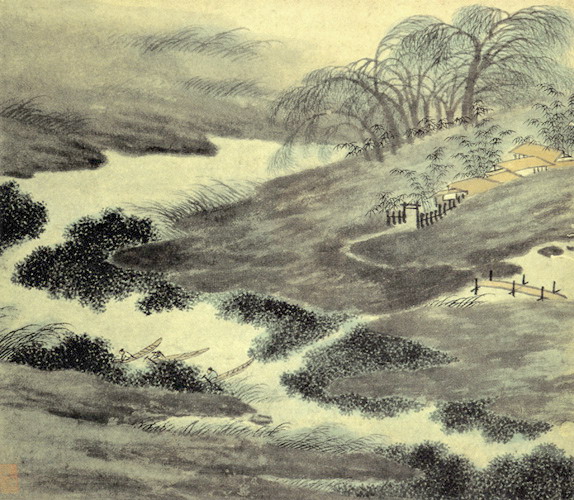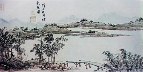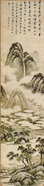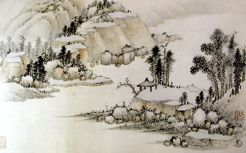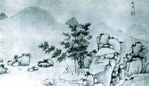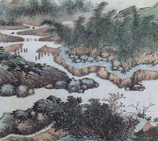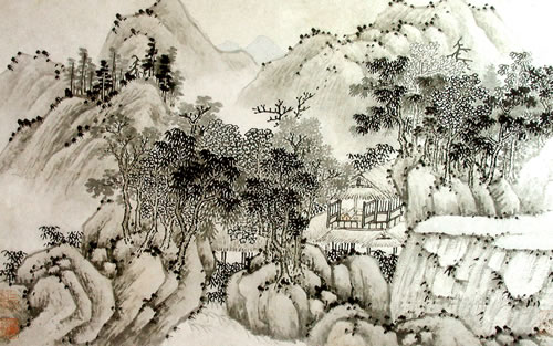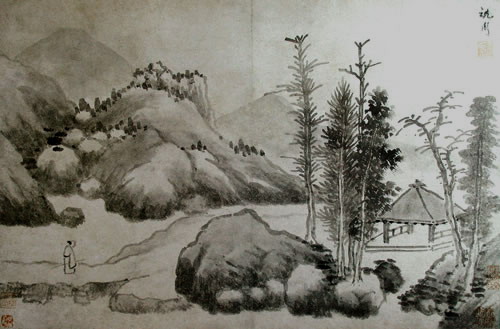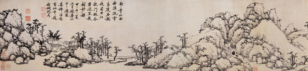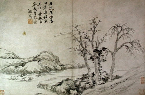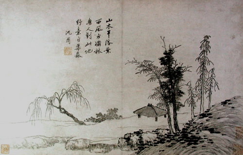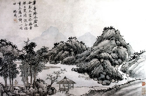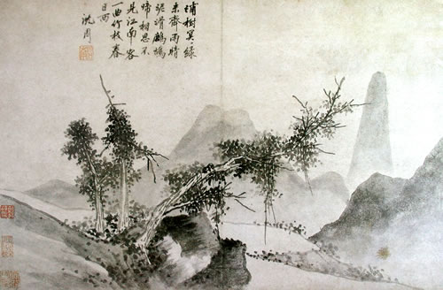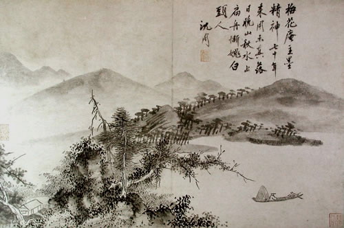 曹履吉《博望山人稿》:石田翁画多用退笔,中锋作小斧劈,当是以意少变北苑,而其源则实出巨然僧、梅道人,苍郁秀润,并极出蓝之妙。