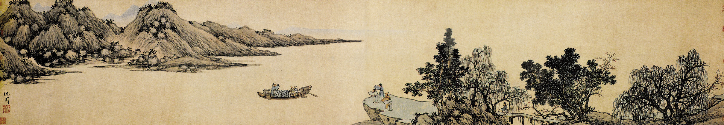沈周(1427-1509) 字启南、号石田、白石翁、玉田生、有竹居主人等。吴门人。明画坛四家之一, "吴门画派"班首,影响深远。曾祖父为王蒙好友,父恒吉是杜琼学生,书画乃家学。诗学白、苏、陆。