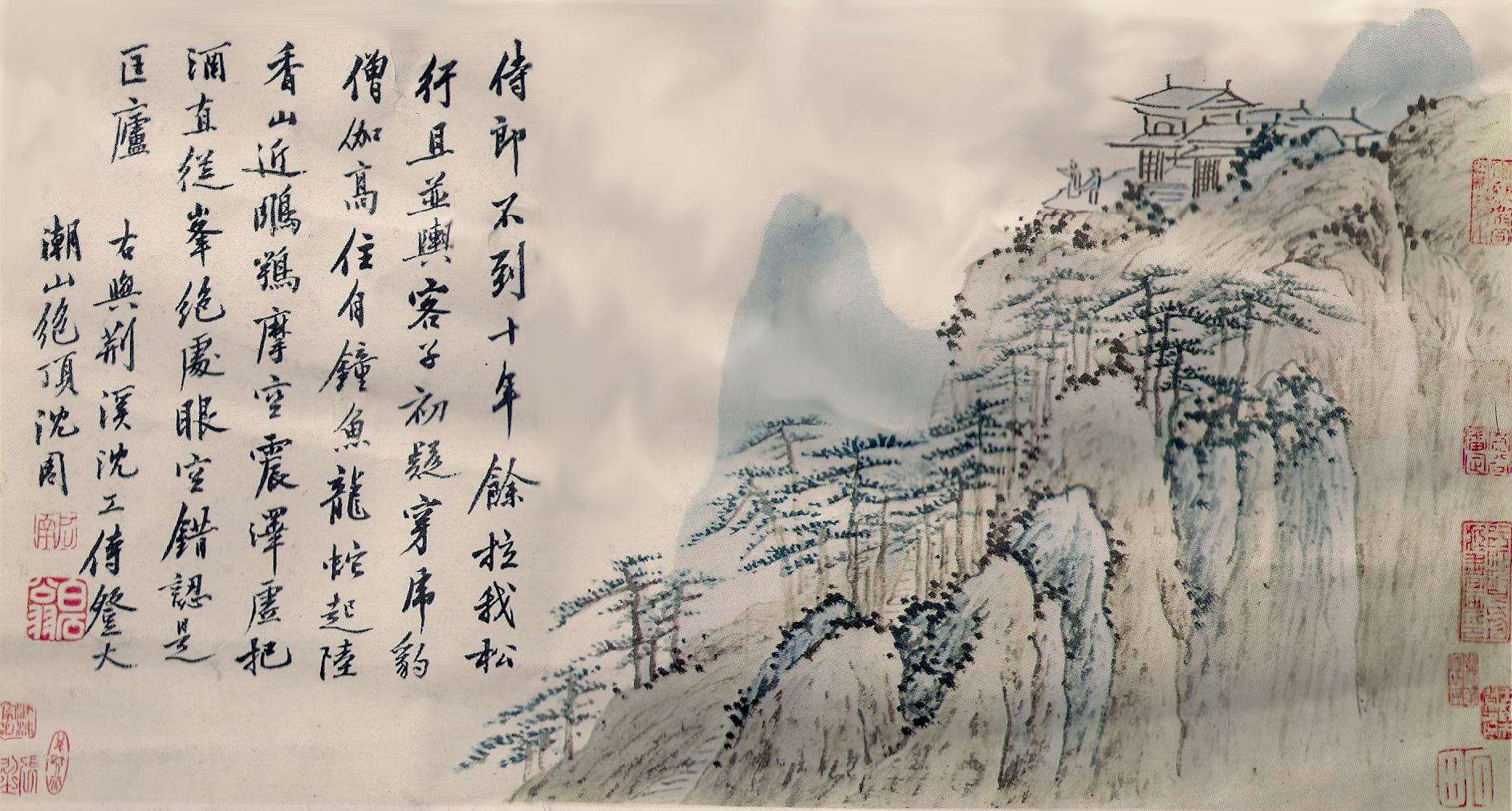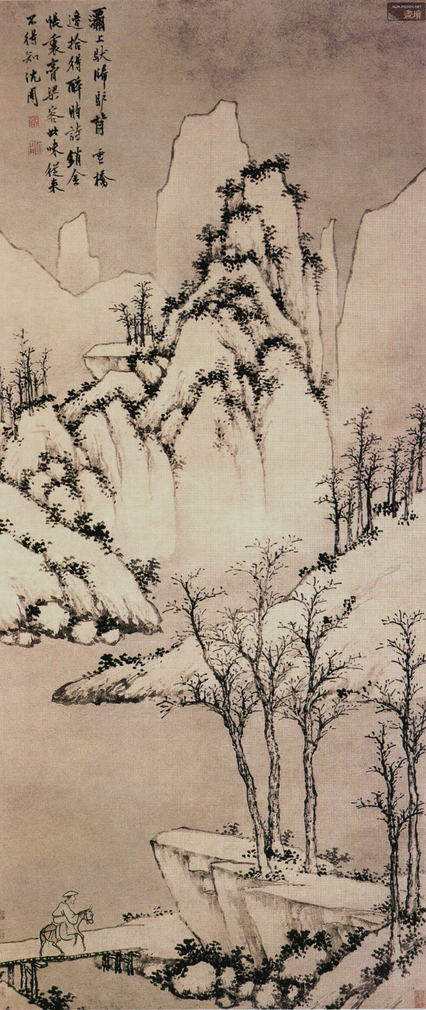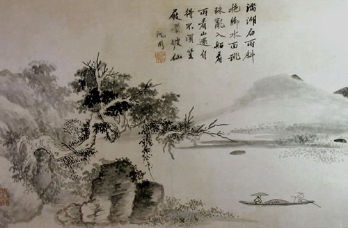 《六砚斋二笔》:沈石田小帧四时山水,仿北苑笔,在鸟戍人家,题句亦甚豪迈。中原七子辈谈诗,谓启南本富诗才,而以题画取办仓猝,故遂入别调。此犹咎张旭纵酒,吴生涂鬼,致笔踪狼藉也,可笑。沈诗曰:「红满枝头绿满湖,水边人影夕阳孤。春波消雪三千顷,赊与溪翁作酒壶。」「雪压高居玉树中,晓来寒栗不禁风。村沽急办双罂碧,卯饮聊充两颊红。」「长竿不属忙人弄,要自闲人管领之。钓月哦风一般趣,黄尘没马是何时。」「湖上新晴宿雨收,平头肪子贴天游。瘿尊容得三千斛,大醉去题黄鹤楼。」又,十年前馀购得石翁奇画一轴,幅阔二尺有咫,高六尺,作翠峰攒天,仅分两聚,下略露陂麓,列树五株,四直一偃,对岸两松亭,亭中虚三尺馀,尽是云气涌郁,挂之屏几间,蒸然欲浮屋也。神来之妙如此。翁亦极满志,题句云:「翠倚高天玉出奇,淋漓元气太阴垂。匡庐嵩少凭君指,醉裹狂挥醒不知。」
